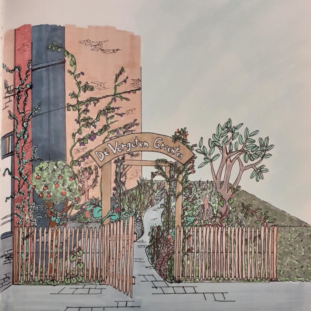 Deze schets beeldt de droom van De Bloeiderij uit; Ik zou graag een plek creëren waar mensen en natuur elkaar ontmoeten, zich thuis voelen en kunnen bloeien.